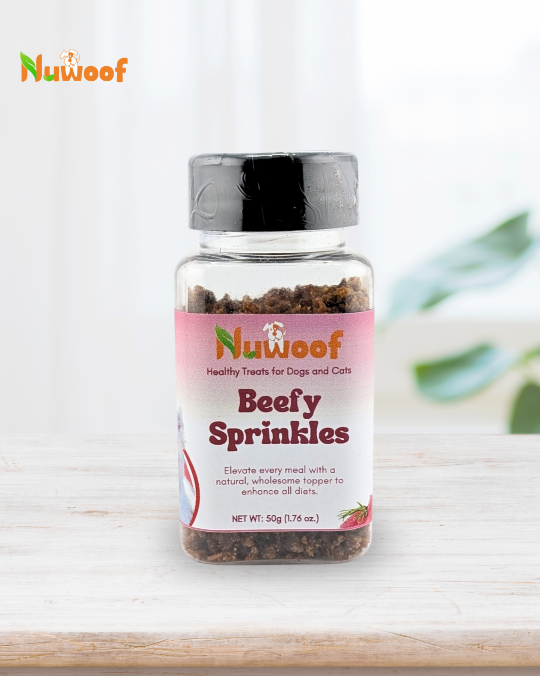 NuWoof Beef Sprinkles are made from 100% premium cuts of beef, dehydrated to preserve its rich nutritional value. Beef is naturally high in protein and iron, supporting muscle development, energy, and immune strength. This robust, meaty topper is especially beneficial for active dogs, growing puppies, or those needing a protein-packed diet.